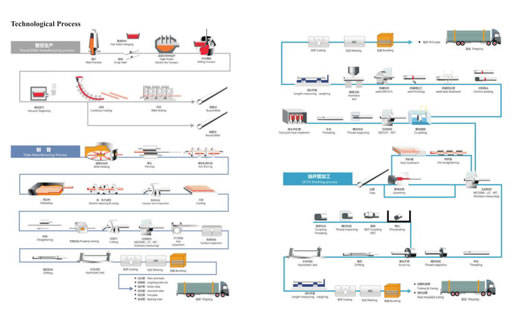 1. Hot-rolled or Extruded Seamless Steel Pipe Round Pipe Billet → Heating → Punching → Three-Roller Skew Rolling, Continuous Rolling or Extruding → Pipe Detaching → Micro Tension Sizing or Reducing → Cooling → Straightening → Hydrostatic Test or Inspection → Marking → Warehousing